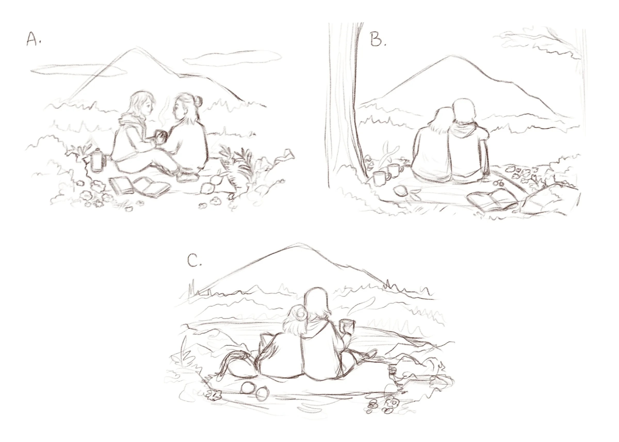 Concept sketches after meeting with client. Included elements of their relationship and after approving the A sketch, added their pets to the image.