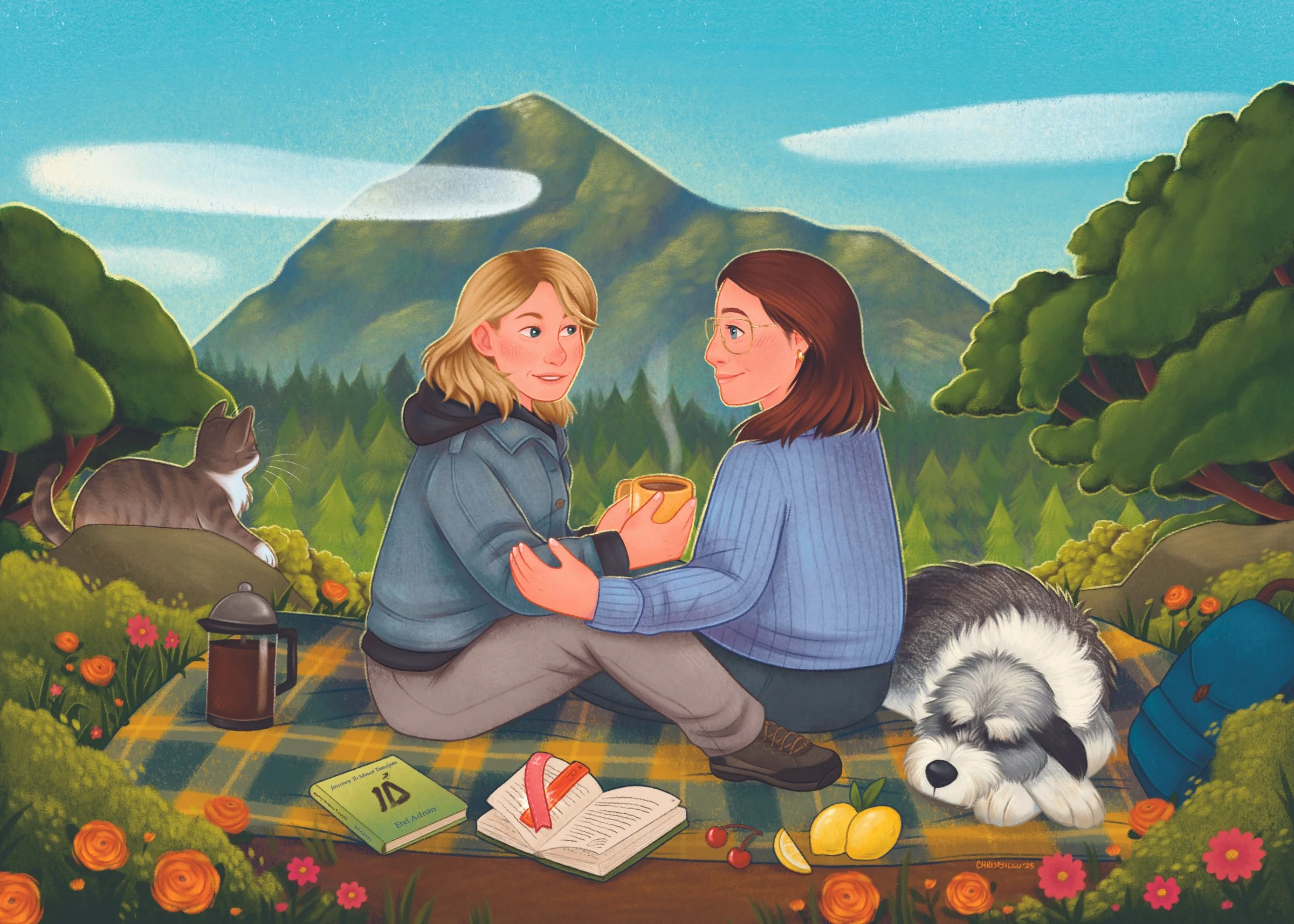 Commissioned illustration for a birthday present of the couples favorite location to hike, featuring their pets and small details from their relationship.